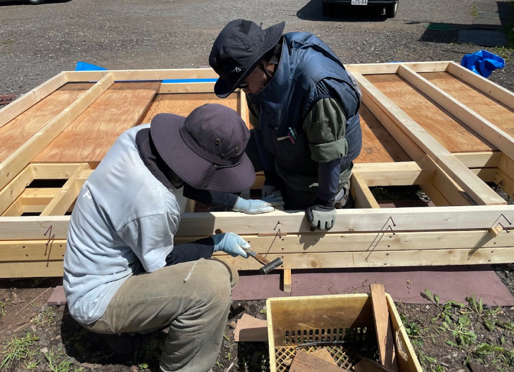 M樹さんは作業着で建築作業!壁作りを一緒にやりました。とてもはかどりました!ありがとうございます!