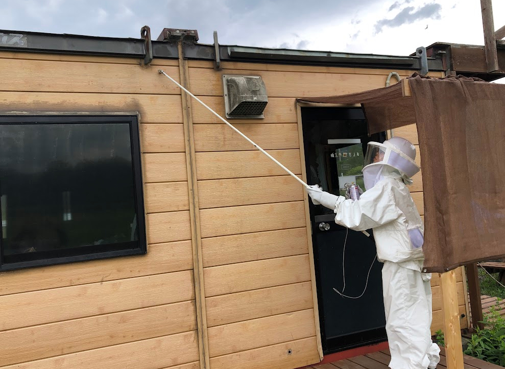 クラブハウスの壁に巣を作ったスズメバチ退治!カナちゃんが役場から装備を借りてチャレンジ!