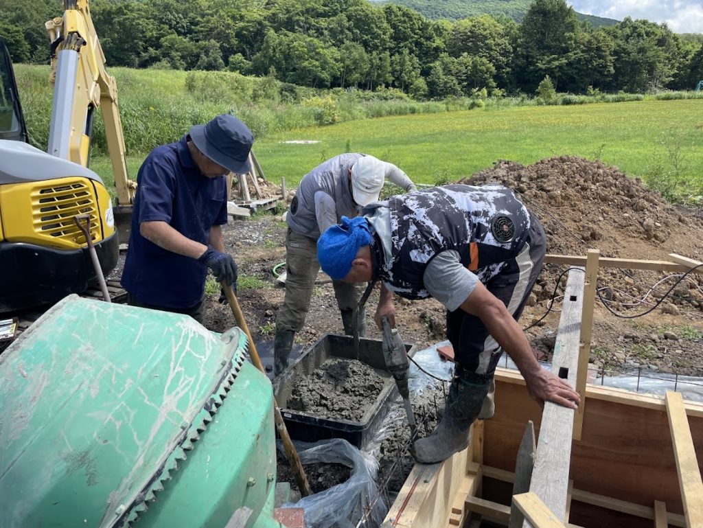 S藤さんとお義父さん、カナちゃん、私でコンクリートを作って流し、ハリーさんはそれをならして決めていくというスーパーコンビネーションで13時ころに充填完了!!