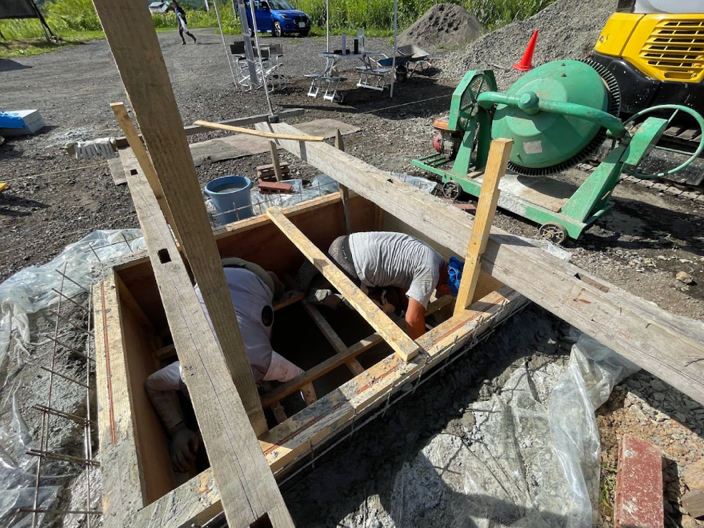 木枠を組んだところにコンクリートを練って充填していく作業。コンクリートは1時間ほどで固まってしまうため、時間との勝負!
