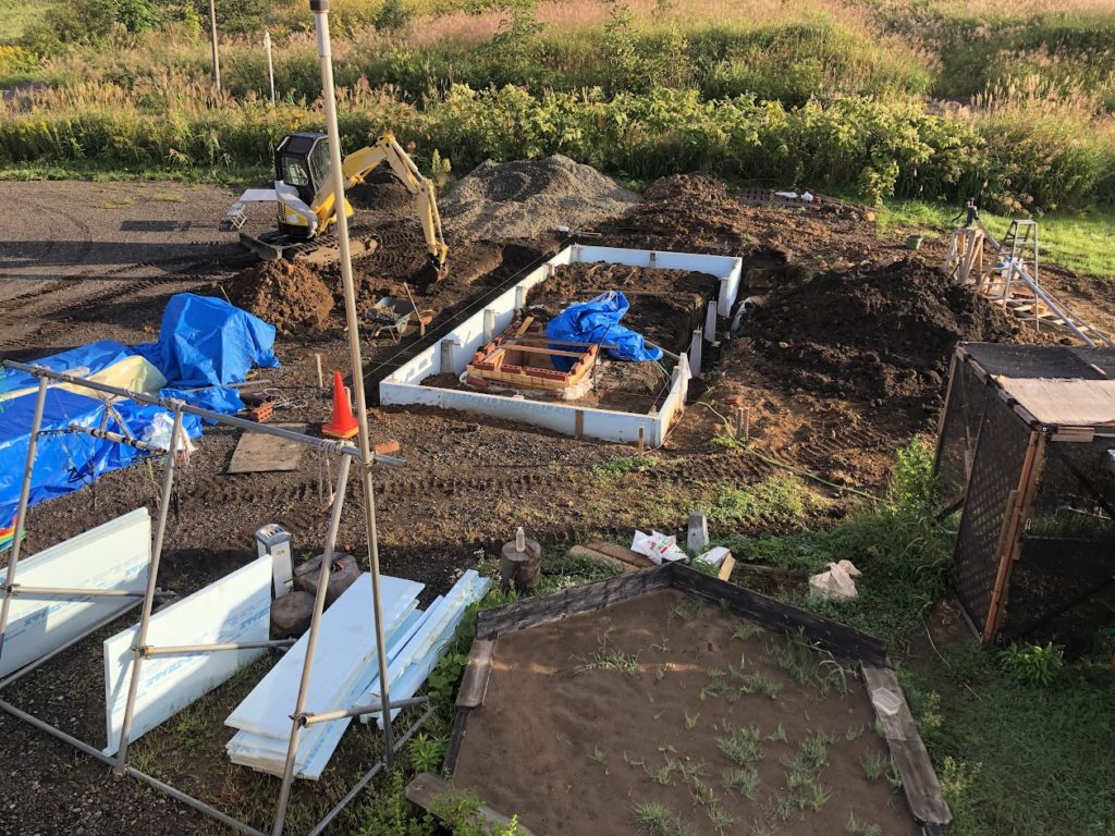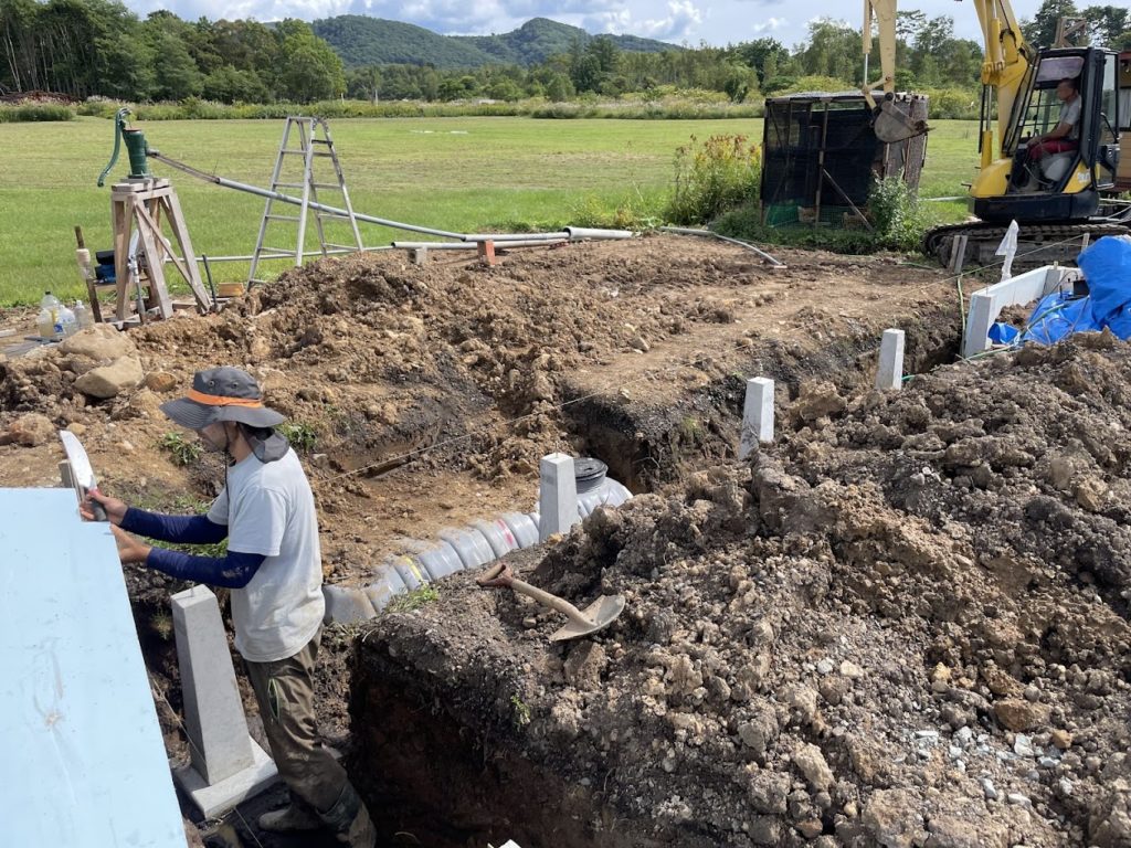水が湧いて湧いて作業の進みが悪い・・・。水を汲みながら束石の外側に断熱材を貼っていきます。