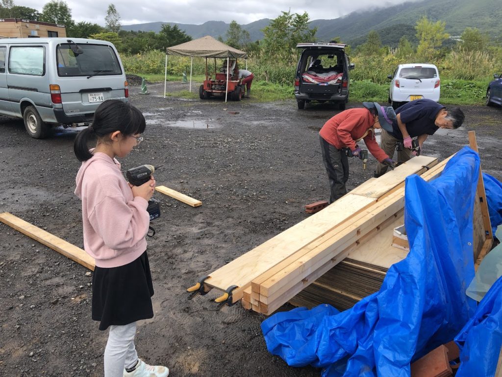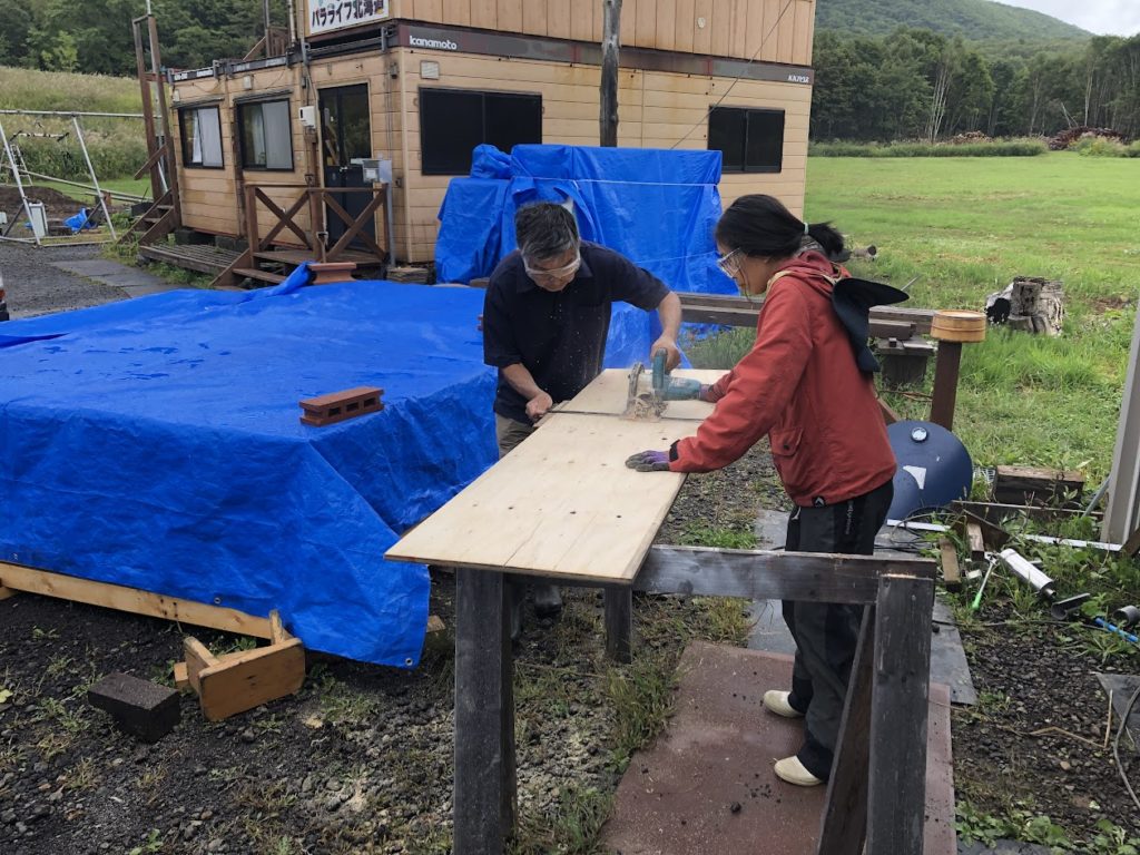お義父さんとカナちゃんメインで板を当ててつっかえ棒作業。