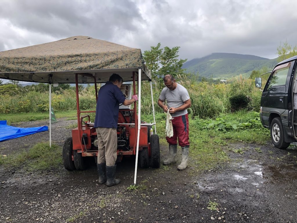 ハリーさんは草刈り機の整備。エンジンがかからない・・・。原因が分からない・・・。