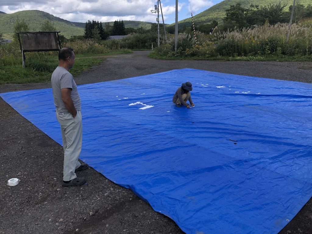 10m×10mのブルーシートをネズミに齧られました・・・。明日の大雨に備えてカナちゃんに穴補修をしてもらいました。