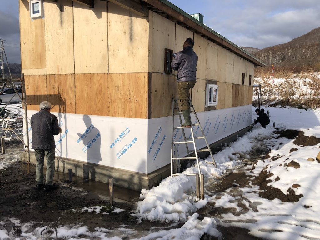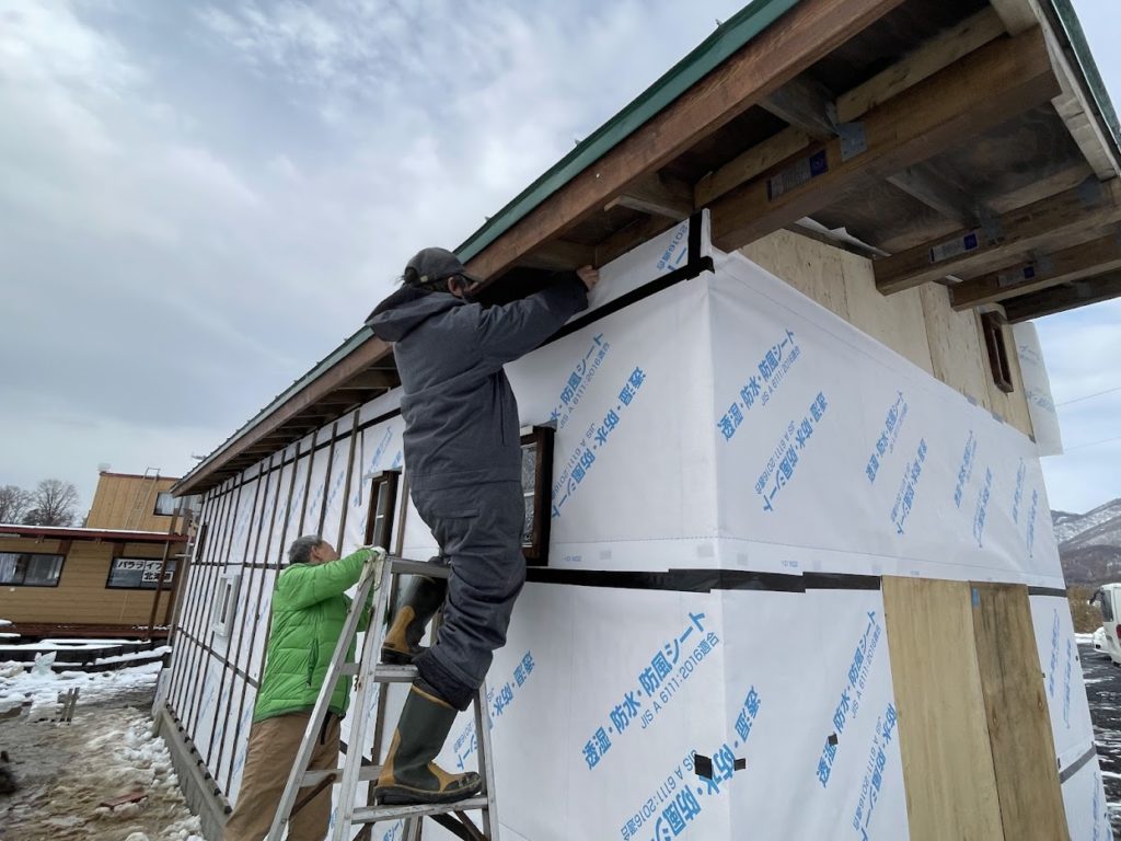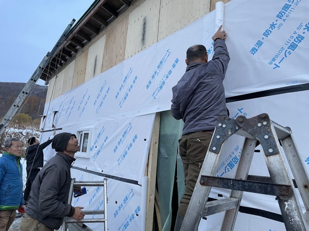 ハリーさんがシートを張り、M樹さんがテープで隙間を埋め、Y田さんとカナちゃんが縦に胴縁を設置していきます!
