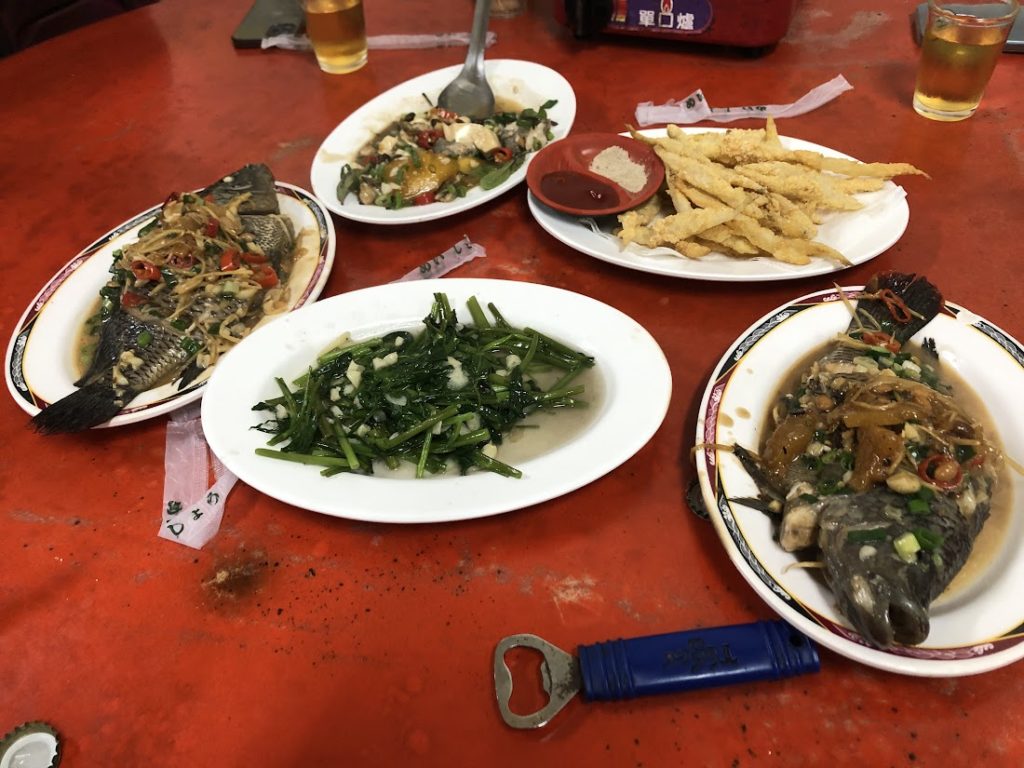 ショーケースに入っていた一番大きな魚を指差し注文。「4名様で4匹?」と言われ、慌てて「1匹!」とジェスチャーしますが、1匹は無理なようで最低でも2匹と。あっさりとした白身魚。ショウガや甘酸っぱい煮込み大根!?と併せていただきます。